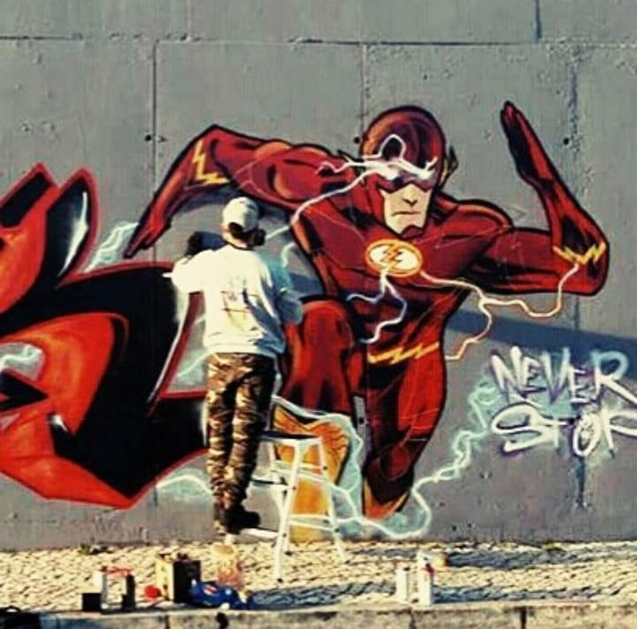 I worked with a group of local artists to paint a mural in front of a High School in Amadora. I contributed with a cartoon piece of The Flash, and could share ideas and also learn a lot from other skilled artists.